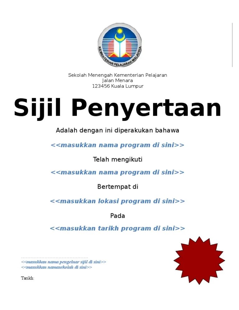 Sijil kosong contoh sijil penyertaan pertandingan template sijil penghargaan e sijil. Flip.my berkongsi bahan terpilih, iaitu contoh sijil penghargaan yang boleh digunakan di sekolah. Bersemangat untuk menyertai program atau pertandingan dianjurkan. Sekolah menengah kementerian pelajaran jalan menara 123456 kuala lumpur sijil penghargaan adalah dengan ini diperakukan bahawa telah memberi sumbangan dan .